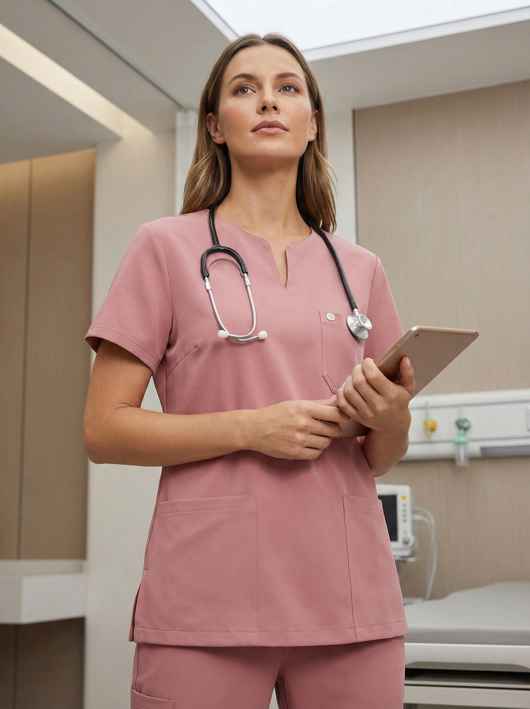 The model wears medical scrub pants. A stethoscope rests naturally around her neck. These elements must remain unchanged in placement, proportion, and realism.