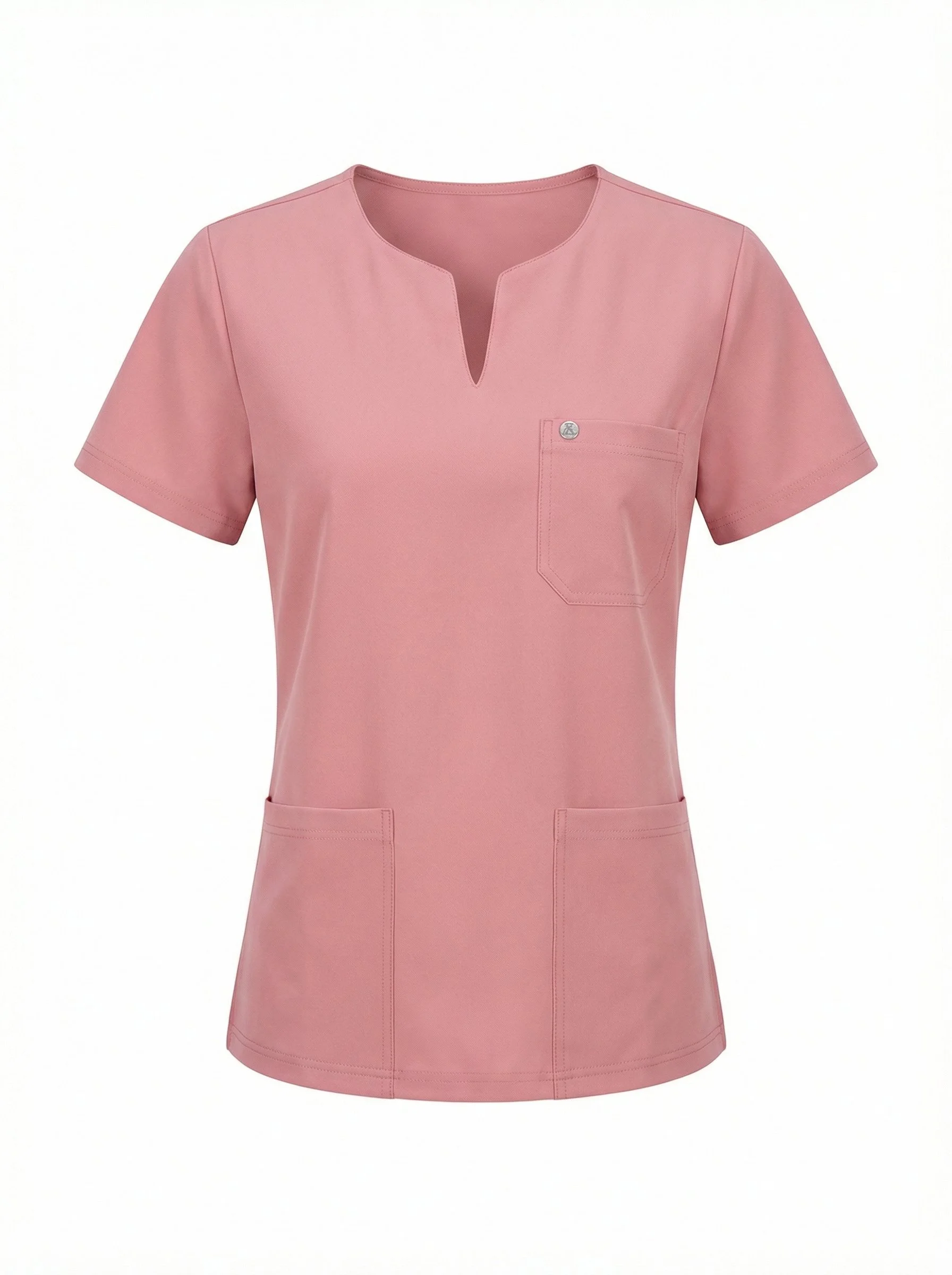 The scrub top is shown flat and structured, naturally aligned. Sleeves fall evenly and symmetrically. The hem is straight and balanced. The V-slit neckline remains clearly defined and structured. The chest pocket and lower front pockets must remain in their exact positions and proportions.