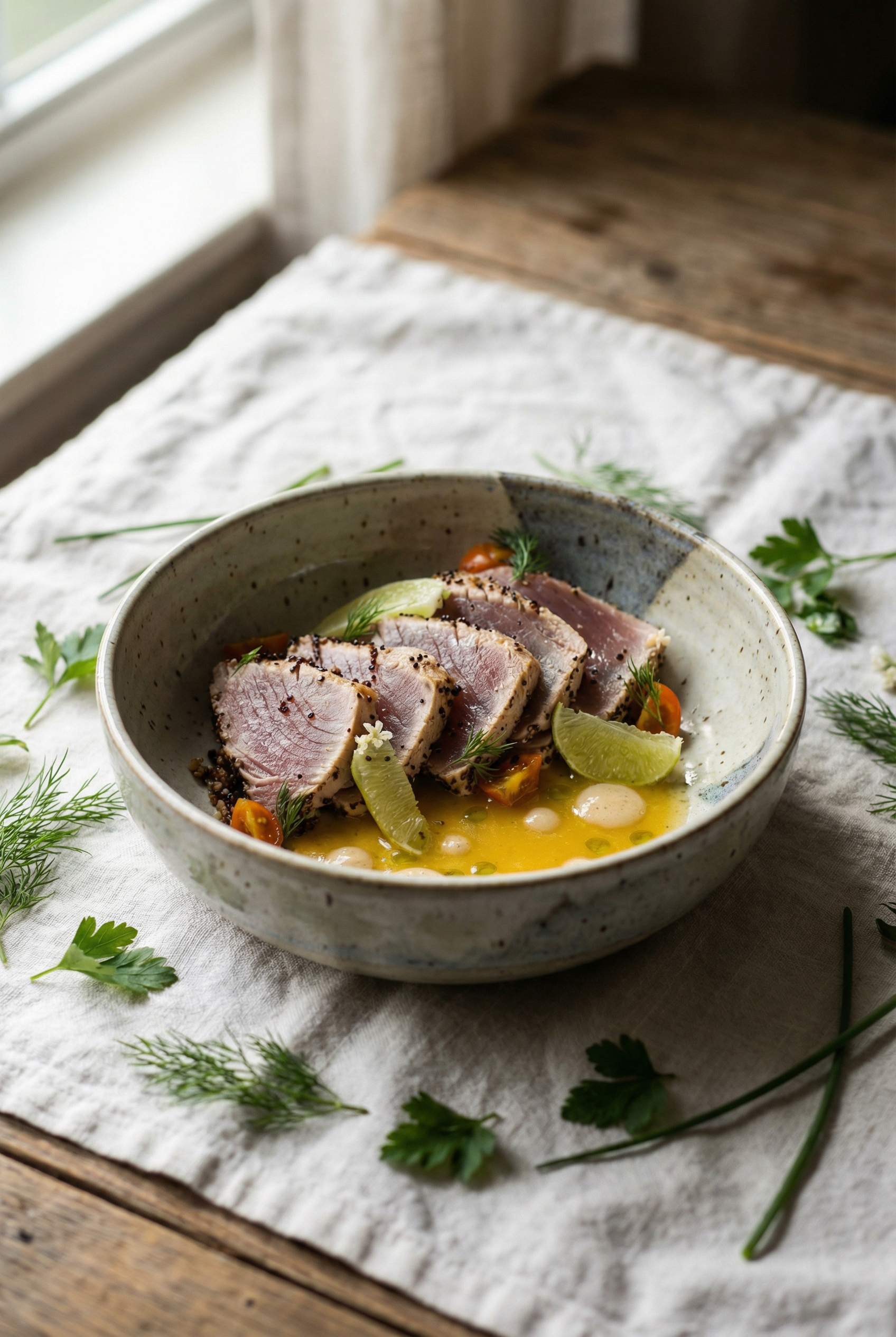 Use the food photo I’ve uploaded as reference. Keep the same dish and plating, placing it in a ceramic bowl on a rustic wooden table draped with a textured white cloth. Add scattered herbs lightly surrounding the bowl, all secondary to the main dish. Use soft directional window light from the left, with gentle falloff into shadows on the right. Retain a warm, intimate mood with subtle contrast and artisanal textures. Depth of field shallow: my dish sharp, cloth and table fading softly. Style: rustic gourmet photography with natural light and quiet atmosphere.