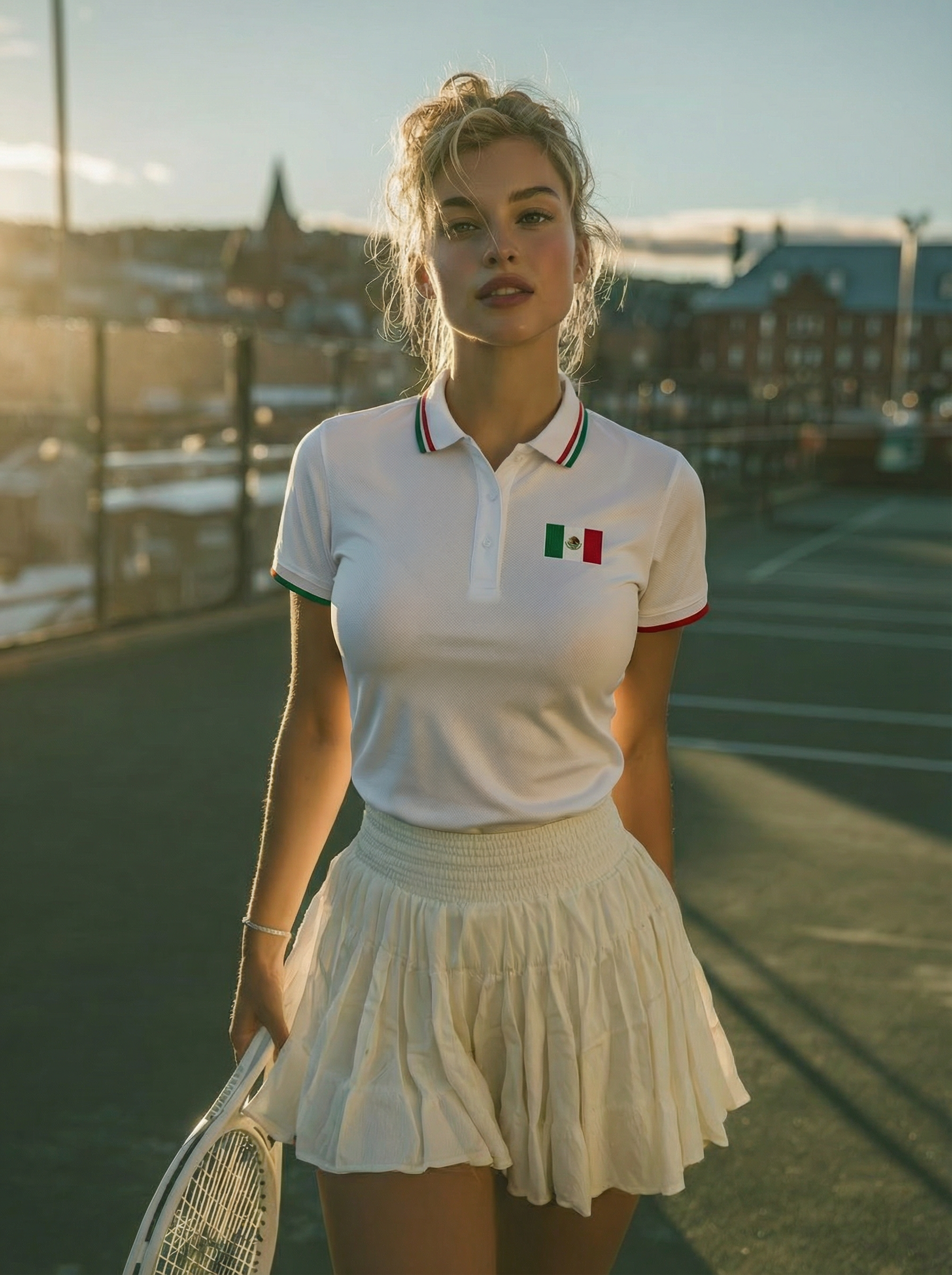 Create a realistic fashion lifestyle photograph with the following scene and constraints.A female tennis player is photographed from a low-angle perspective, creating a strong, dynamic and confident composition. The camera is positioned below the subject, looking upward toward the sky.The model stands with her torso slightly arched. One arm is bent and raised behind her head, resting on the back of her neck. The other arm is lifted outward, holding a tennis racket behind her shoulder. The pose is elegant, athletic, and frozen, not in motion.The model’s face is visible, tilted slightly upward toward the sky, with a calm and confident expression. Hair is pulled back tightly, clean and minimal.The background is a clear blue sky with no clouds or distractions. The sky fills the entire frame and must remain clean, bright, and uniform.The model wears a white tennis skirt with soft pleats and a fitted waistband. She also wears minimal jewelry (thin bracelets). These elements must remain unchanged.Only replace the upper garment (the top).Apply the top provided as the input image onto the model.The new top must match the input garment exactly in color, fabric, texture, fit, proportions, logos, text, typography, embroidery, prints, and labels. Do not redesign, stylize, or alter the garment.The top must fit naturally to the body, following realistic fabric tension across the chest and torso, with smooth, clean surfaces and subtle natural folds.Lighting is natural daylight, direct but soft, with clear highlights and natural skin tones. Color grading is realistic and clean. Camera angle, framing, pose, background, and styling remain unchanged.Professional fashion lifestyle photography. Ultra-realistic. Garment replacement only.pose locked, background locked, camera locked, only top changes